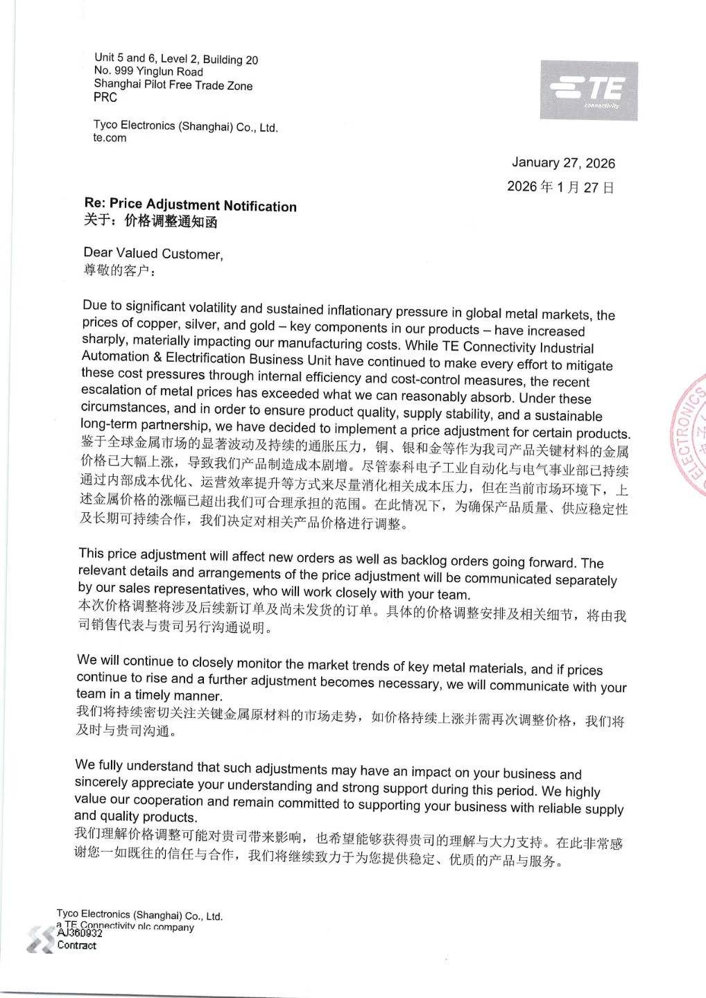 2026年1月27日発表 TE Connectivityの製品が2026年3月2日をもって値上げになります。 これは2025年12月4日以来の値上げ通達となります。TEをご購入されている場合はお早目のご注文検討をよろしくお願いいたします。